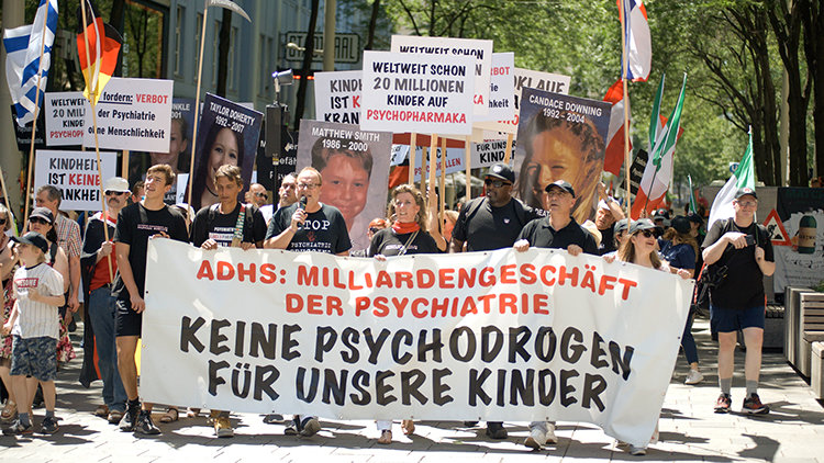 They carried a large banner proclaiming, “ADHD: Billion-dollar business for psychiatry—no psych drugs for our children.” Protesters carried placards citing points of abuse in psychiatry with youth. This includes the fact that today at least 20 million children are taking psychiatric drugs worldwide, drugs that can include “side effects” of homicidal or suicidal ideation. Placards also made it clear that “Childhood is NOT a mental disorder.”