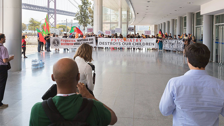 As psychiatrists from across the world arrived at the Congress Center Lisboa in Lisbon, Portugal, for the annual World Psychiatric Association (WPA) Congress, they never expected what would greet them—CCHR protesters from across Europe demanding the abolition of damaging psychiatric practices. They stood right at the Congress Center’s front door with banners proclaiming “Psychiatry Destroys Our Children,” “Psychiatry: Lies That Destroy Families and Lives” and “Report Psychiatric Drug Abuse of Children.”